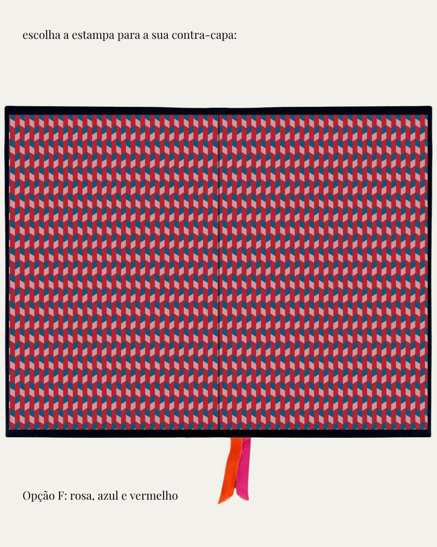 Personalize a sua: escolha a cor da capa, a estampa da contra-capa, um par de fitas de gorgurão, suas iniciais e até mesmo um desenho feito à mão para torná-la única.