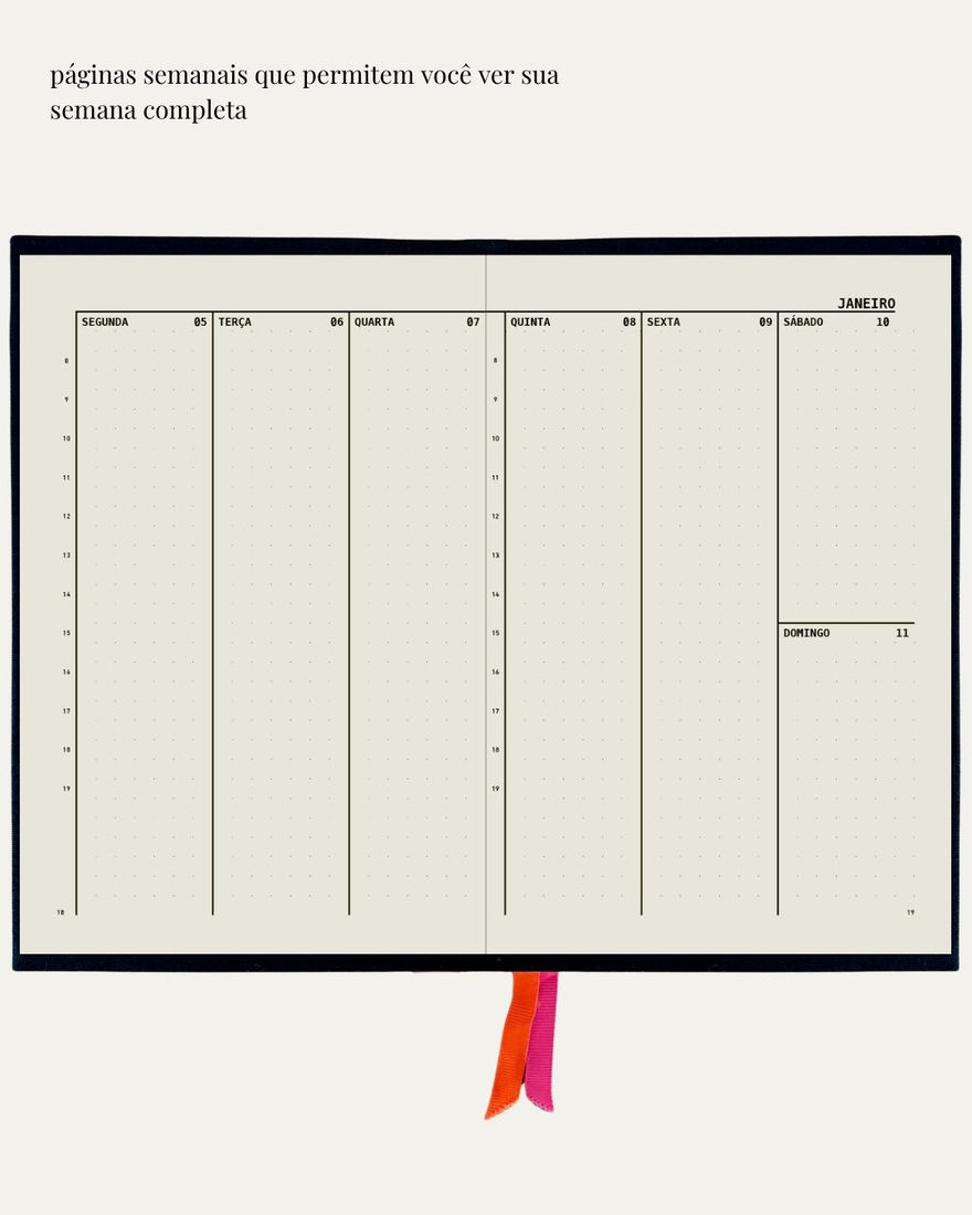 Nossa agenda anual foi pensada para quem busca praticidade sem abrir mão da liberdade criativa. Com páginas semanais intercaladas por folhas em estilo bullet, você pode alternar entre planejamento e anotações livres — criando um formato que se adapta à sua rotina.