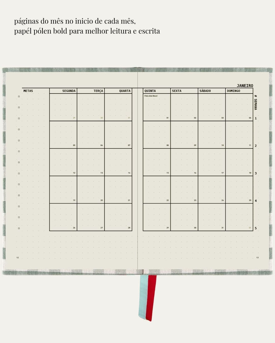 Nossa agenda anual foi pensada para quem busca praticidade sem abrir mão da liberdade criativa. Com páginas semanais intercaladas por folhas em estilo bullet, você pode alternar entre planejamento e anotações livres — criando um formato que se adapta à sua rotina.