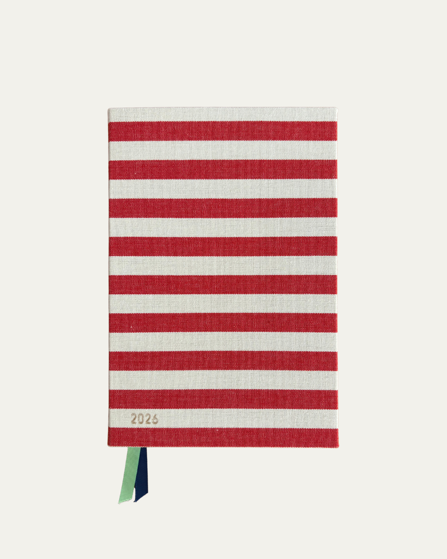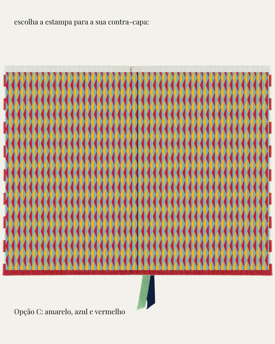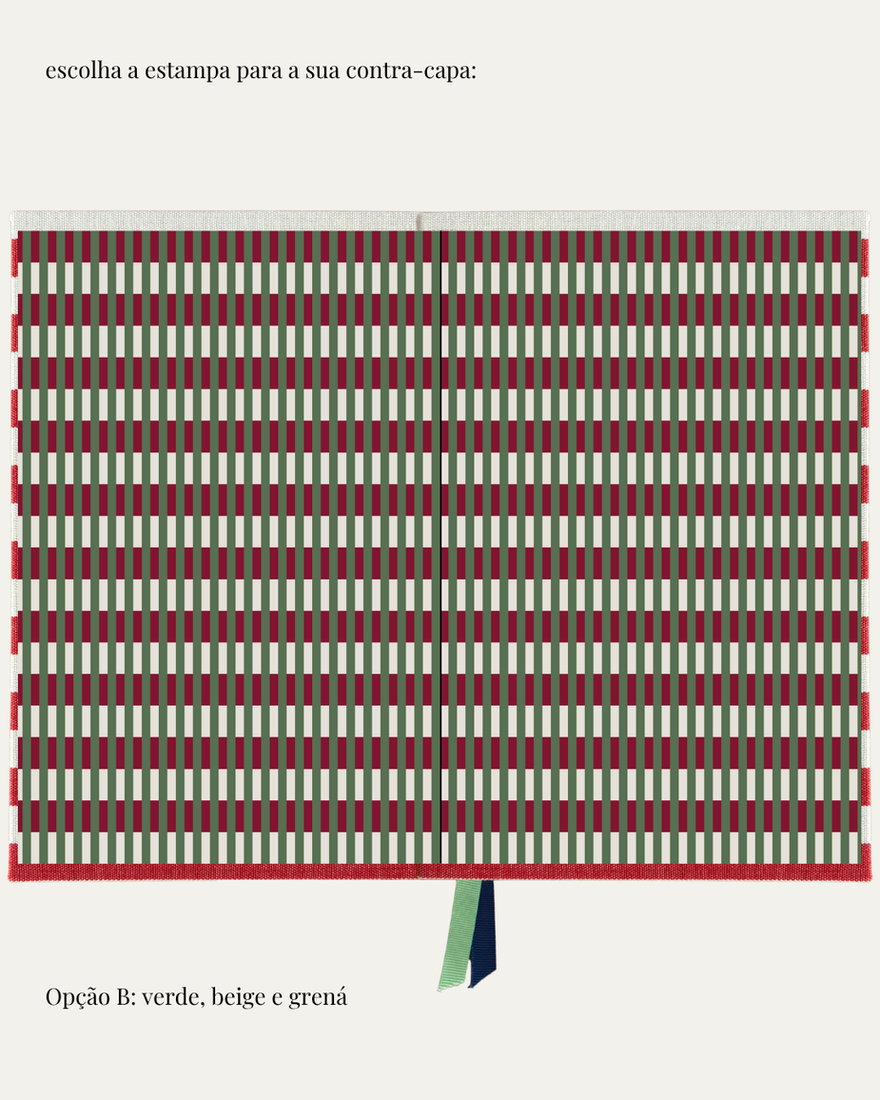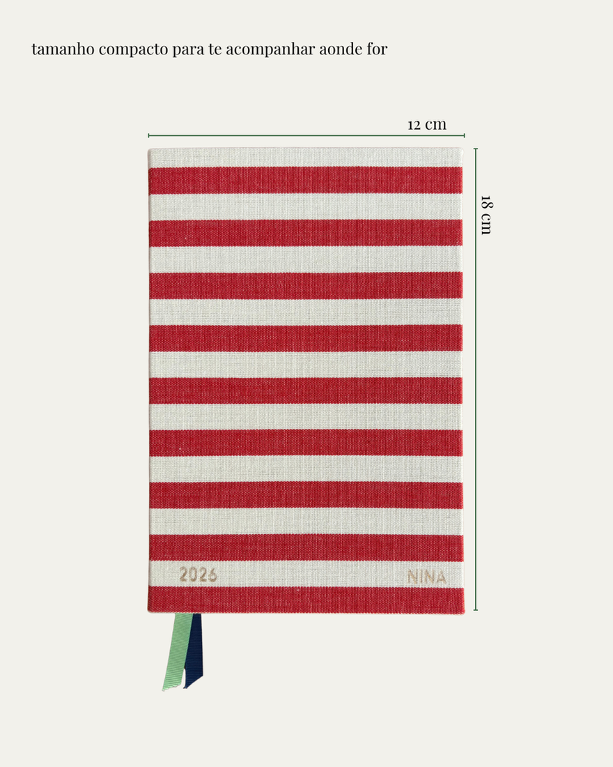Capa: Tecido brim de algodão listrada vermelha e offwhite, com ano, logo (verso) e personalização em foil dourado.