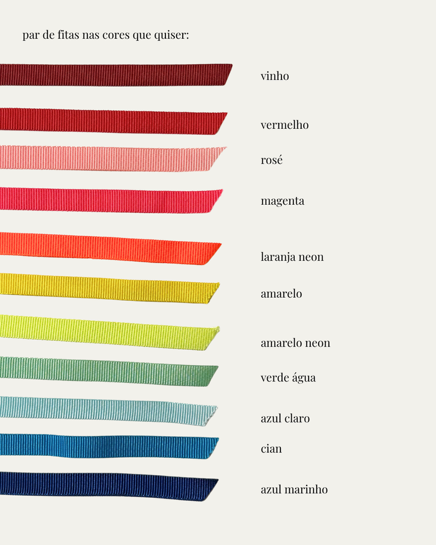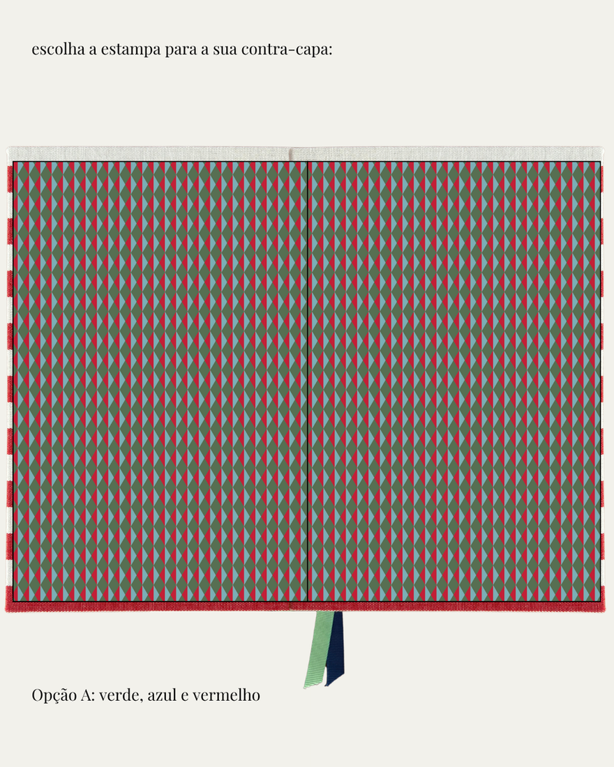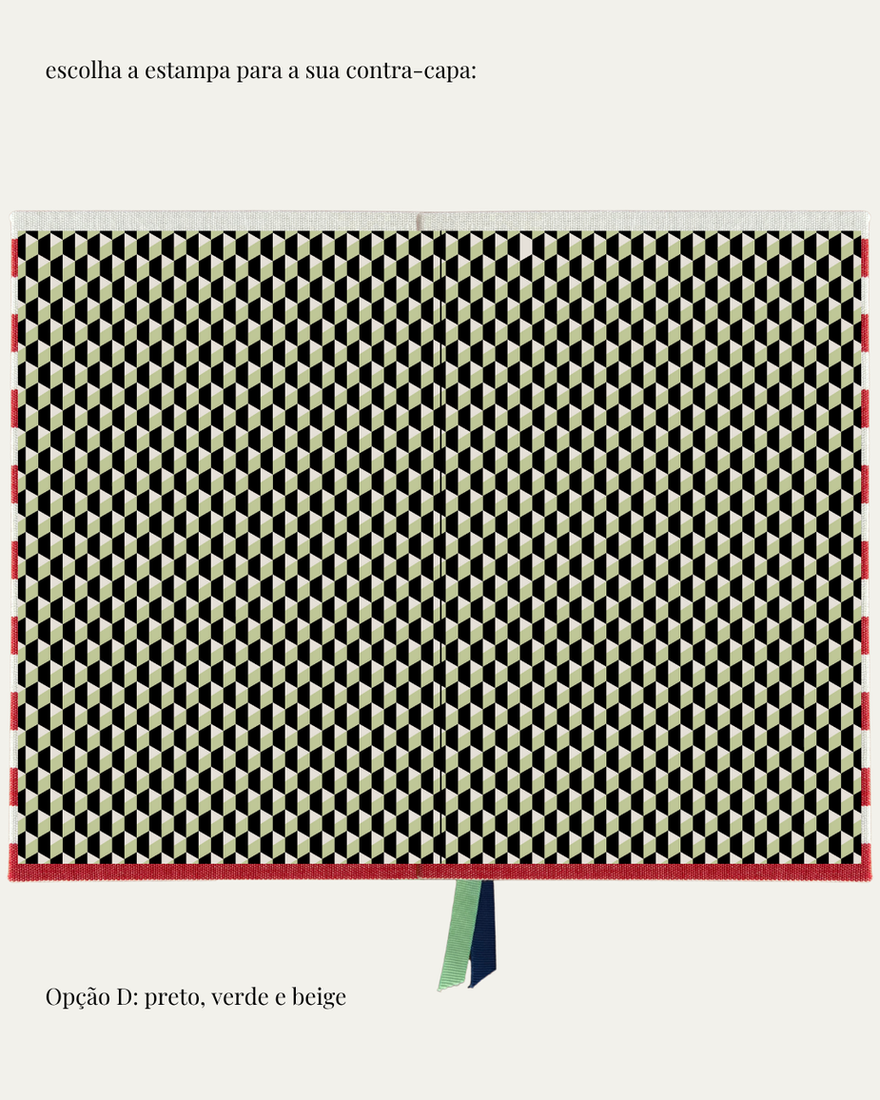 Personalize a sua: escolha a cor da capa, a estampa da contra-capa, um par de fitas de gorgurão e suas iniciais.