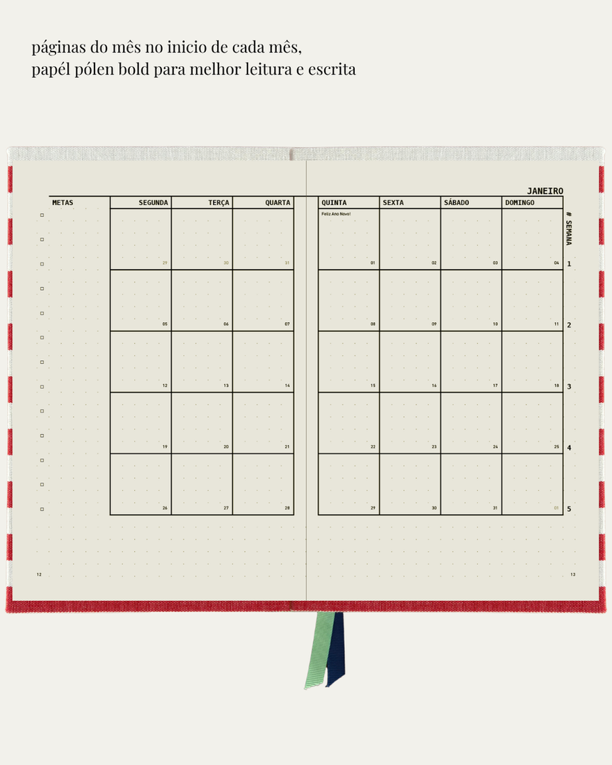 Nossa agenda anual foi pensada para quem busca praticidade sem abrir mão da liberdade criativa. Com páginas semanais intercaladas por folhas em estilo bullet, você pode alternar entre planejamento e anotações livres — criando um formato que se adapta à sua rotina.